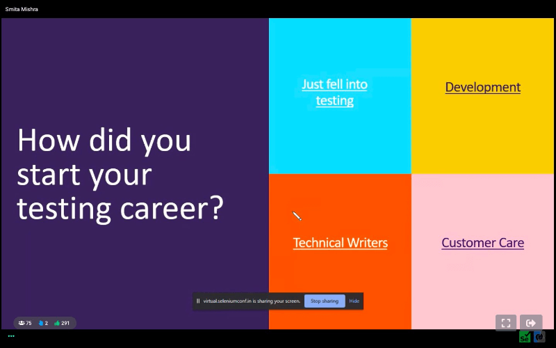 Smita Mishra gave a captivating talk where she invited all testers to think what alternative paths could be present in their careers, given that some organizations value testing more than others. Smita showed that if you understand what you enjoy the most, and find a way to combine that with your current and future skills, it could show you how to grow your career by finding and following a path of the least resistance.
